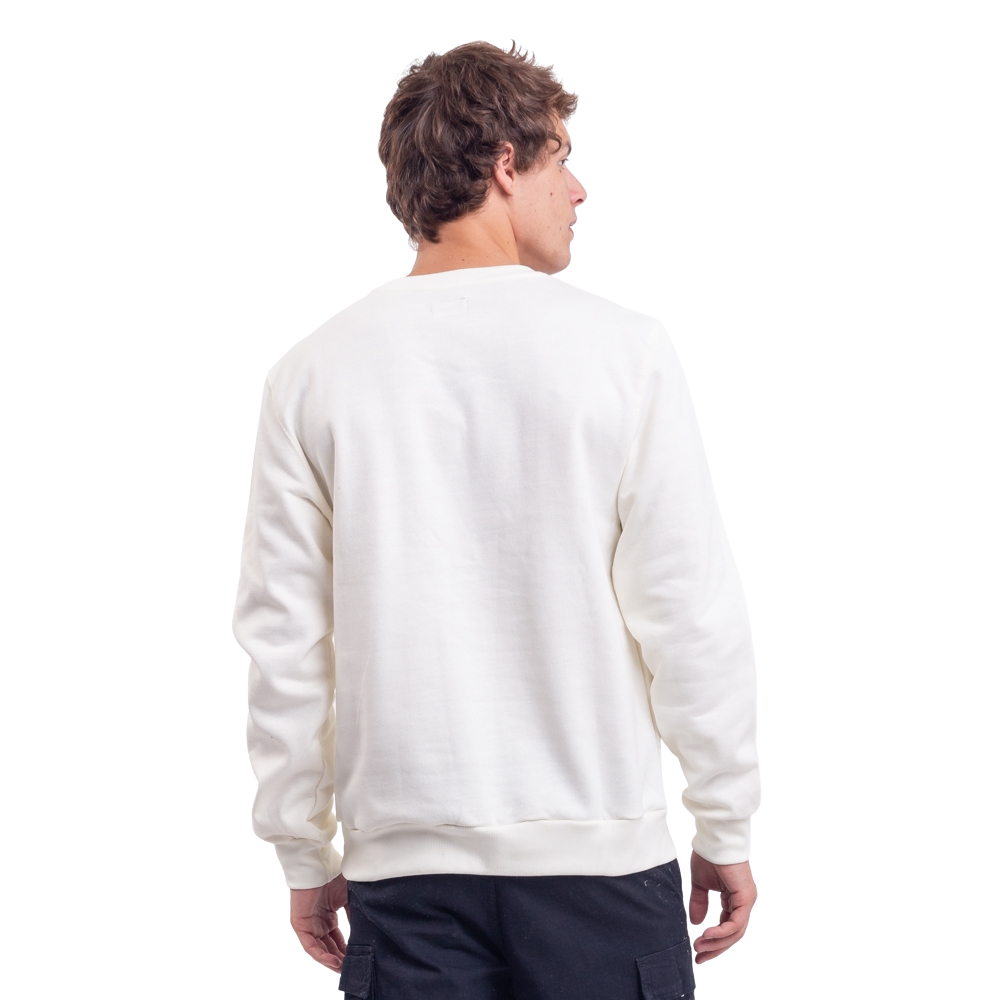 Moletom gola careca 240g com felpa, ribana na barra do corpo e nas mangas, além de contar etiquetas personalizadas.