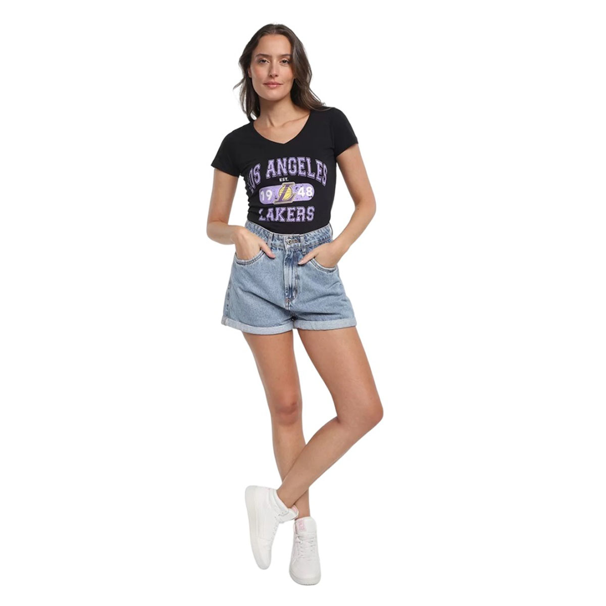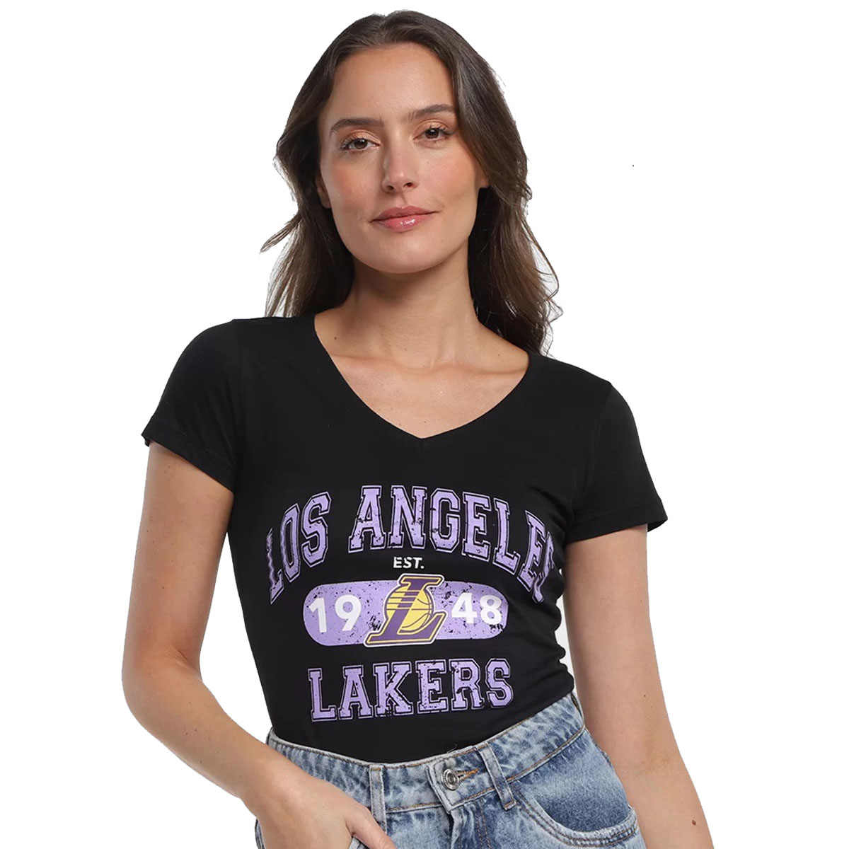 A Camiseta NBA Feminina Lakers Club Original é perfeita para mulheres adultas que buscam estilo e conforto no dia a dia. Feita 100% em algodão, possui um desenho estampado exclusivo da NBA. Com manga curta e gola V, é ideal para uso casual. Seja única com este lançamento exclusivo da NBA.