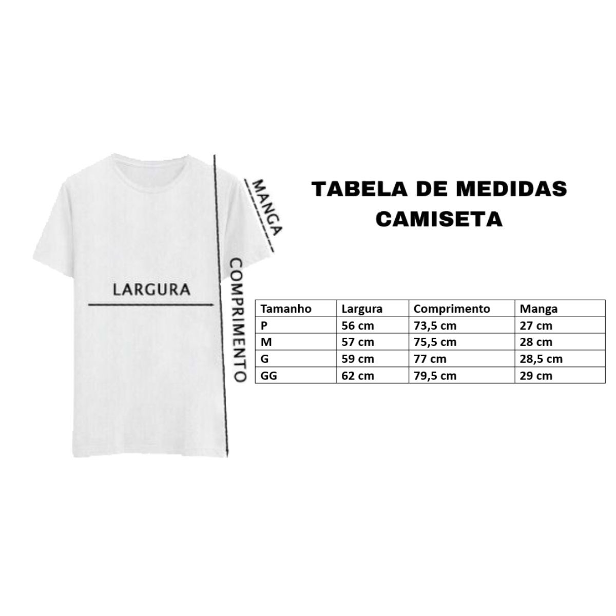 Tamanho GG – Largura: 62cm; Comprimento: 79,5cm ;Mangas: 29cm
