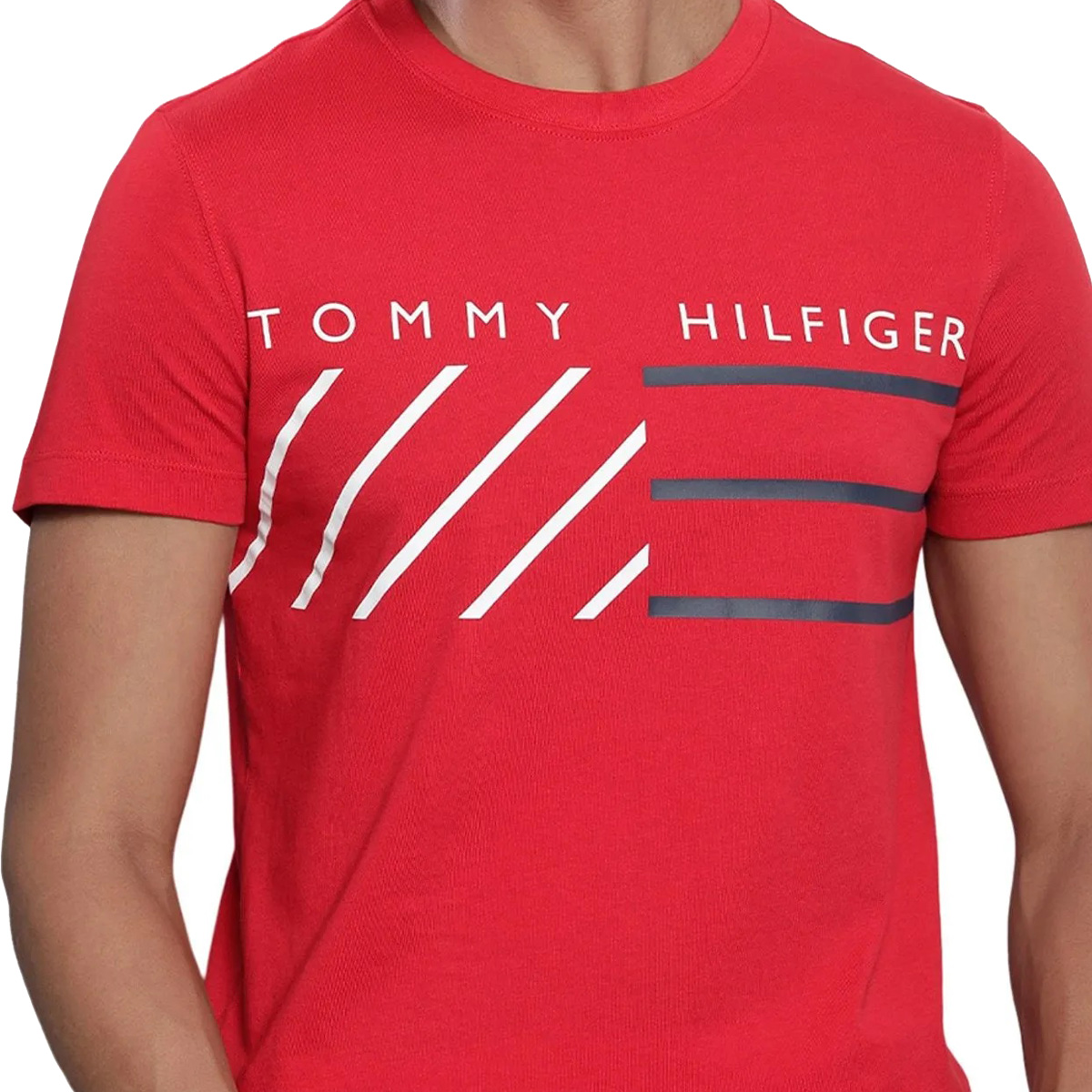Estampa frontal com listras TOMMY HILFIGER nas cores preta e vermelha.
